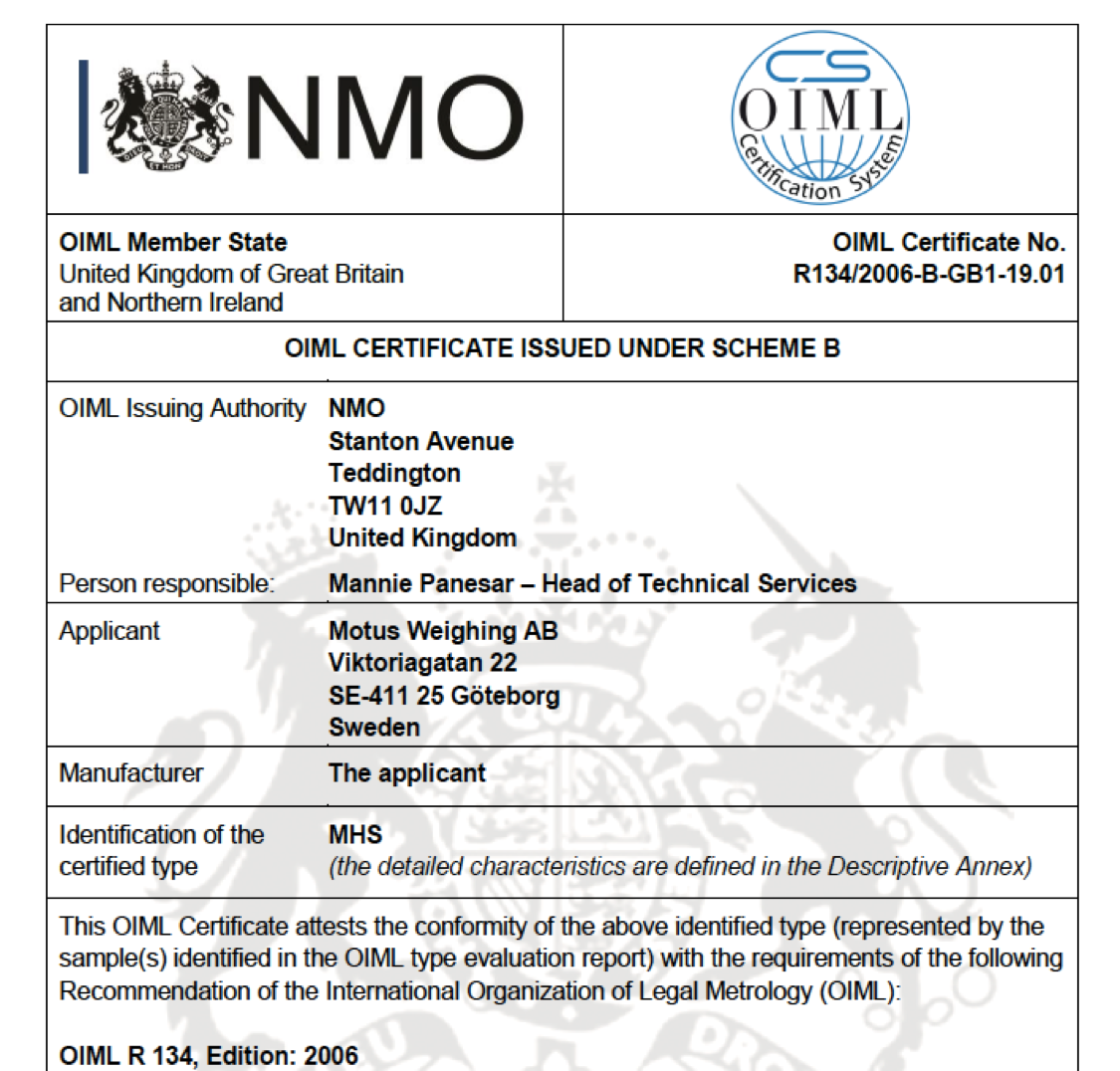 Based on the OIML R134 certificate NMO has awarded a Brittish type approval for MHS under "Section 12" in the Brittish regulation meaning MHS is "legal for trade" in the UK and in all Member States of the European Union under the regulation on "mutual recognition".